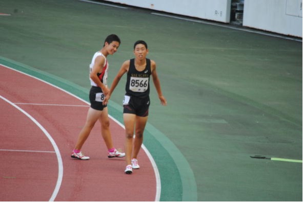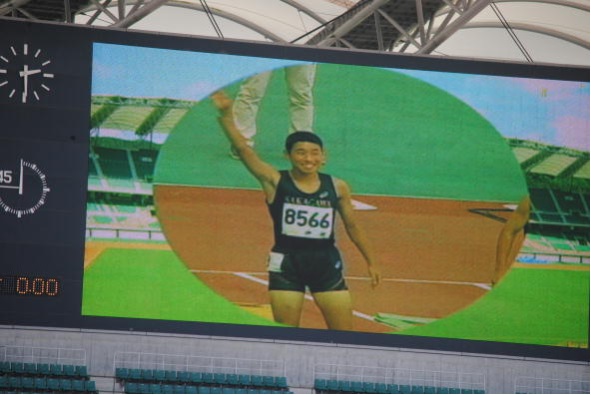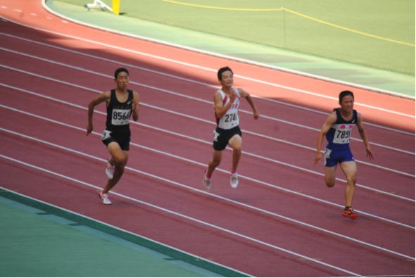 ランチに時間をかけすぎた我々が慌ててエコパに戻ると、14時20分。決勝レース開始直前でした。6位までに東海大会の出場権が与えられるレース。祈るような思いで応援する陸上部のみなさん。航平くんはその応援団の目の前、第9レーンを走ります。決勝レースでは選手名がアナウンスされると、大型ビジョンに選手の表情が映し出されました。さすがは県大会と、感心していると、大勝負前とは思えないほどリラックスし、満面の笑顔で手を振る杉山くんが映し出されました。その表情を見て、とてもいい結果で出そうな予感がしました。号砲一発ついに始まりました。わき上がる大歓声。レースは上位3人以外はダンゴ状態で、順位は肉眼では判別できませんでした。しかし、直後に栄川中陸上部員はスタンドで狂喜乱舞となります。電光掲示板に「第4位 杉山航平 記録11秒33」が表示されたのです。この瞬間、杉山くんの東海大会出場が決定したのでした。