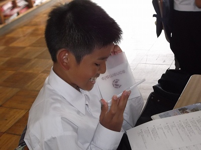 また、昨日は帰りの会で保健指導として、口の健康を調べる「シグナルキャッチ」を行いました。だ液を付着させたシートを使って、口の中の状態をチェックし、ハミガキや食生活に一層気を付けられるようになることを目的としたものです。みんな、手鏡をのぞき込んで、真剣に取り組んでいました。
