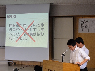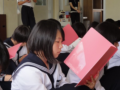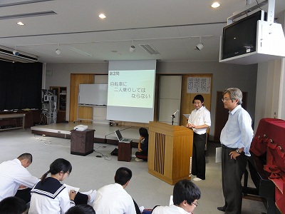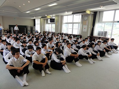 6/21(金)の栄中〜夏休み前恒例の交通安全教室が開かれました。今年は、生活委員会を中心にパワーポイントで交通ルールや通学路の問題点を取り上げ、学習しました。二人乗りや無灯火、携帯を使いながらの自転車運転、傘さし運転などが違反であることを再確認した後、通学路の写真を使って、どこで、どんなことに気を付けなくてはいけないかを生徒や先生のプレゼンテーションで学ぶことができました。夏の交通安全運動もまもなくスタートします。一人ひとりが気を付け、安全で健康な夏を迎えたいですね。