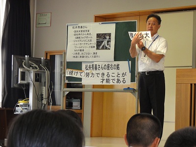 6/3(月)の栄中〜今日の朝礼は校長先生のお話でした。野球部やソフト部の顧問として、選手としても活躍された校長先生らしく、元プロ野球選手の松井秀喜さんに関するお話でした。松井さんの「努力できることが才能である」を具体的にお話しくださいました。言葉の前に「続けて」と入れることで、より分かりやすくなりました。だれにでも才能はあるのですが、それを伸ばすにはたゆまぬ努力が必要なのでしょうね。