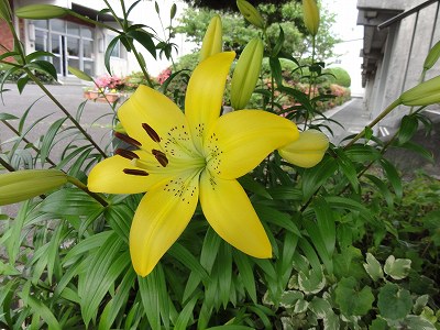 本校のプール下花壇の黄色いユリがやっと花を付けました。とてもきれいで、豪華でいい感じに咲いています。