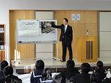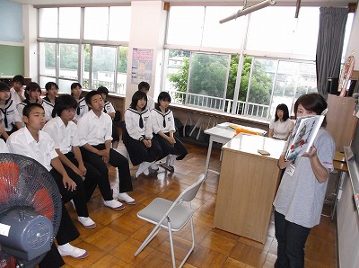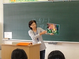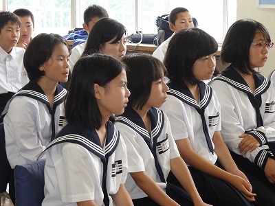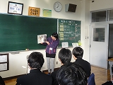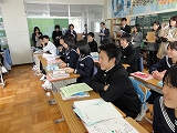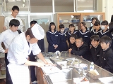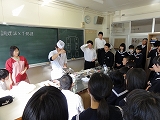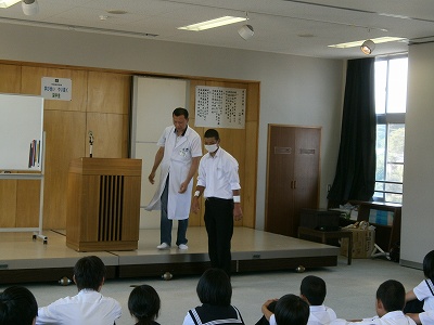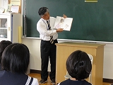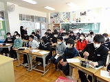 また、2年生の家庭科では、地元で料理店を営む榛葉さんに来ていただき、魚のさばき方を教えていただきました。アジとイワシを使い、見事な包丁さばきを披露していただき、2年生は感動していました。ありがとうございました。さて、来週は自分たちで調理実習です。うまくできるといいですね。がんばってください。