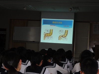 今日の栄中〜今日は第5時間目に学校健康委員会が開かれました。テーマは「排便から健康を考えよう」ということで食生活の改善や消化に関する学習をしました。講師として、校医の樋口先生、学校歯科医の袴田先生に来ていただきました。初めに健康委員会から排便や食生活に関するアンケート結果が示されました。それらをもとに、樋口先生から胃や腸などの消化器に関する病気とその予防などについてのお話をいただきました。消化器系の病気は大人の病気というイメージがありましたが、中学生段階でも考えなくてはならないことがあることがわかりました。今日、学んだことを生かして、よりよい食生活や生活習慣に改善できるといいですね。