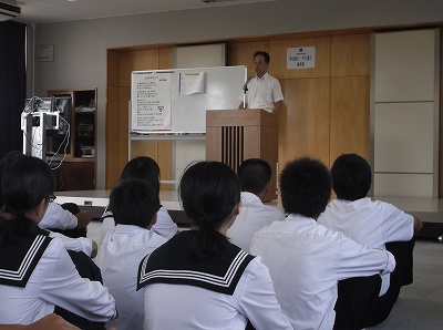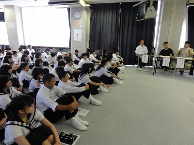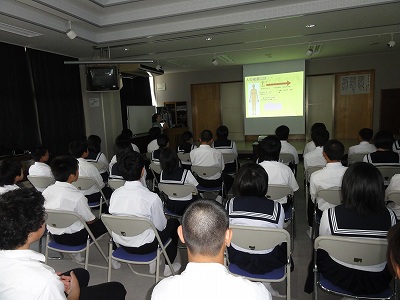 9/12(木)の栄中〜9/9(月)の6時間目は薬学講座でした。日常使用する医薬品のことについて、学校薬剤師の袴田高弘先生からお話ししていただきました。温湿布と冷湿布の違いを2年生の山崎くんが身をもって体験してくれました。続いて、掛川警察署の伊沢敏先生から覚醒剤などの薬物に関するお話をしていただきました。薬物だけでなく、「脱法ハーブ」などについてもその危険性などを教えていただきました。