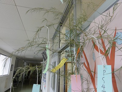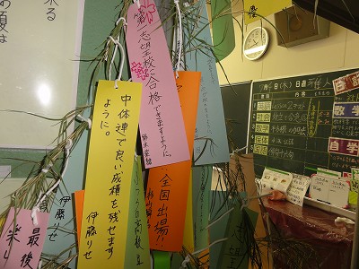また、今週末は七夕なので、各教室に七夕飾りが用意されました。3年生のクラスには、志望校合格や中体連での勝利などの願いが掛けられていました。夢が叶うといいですね。