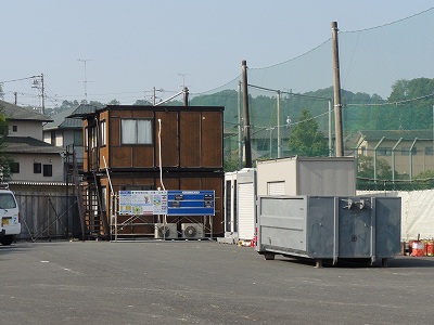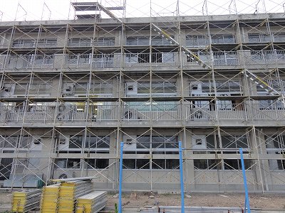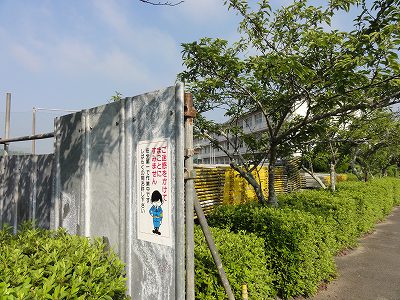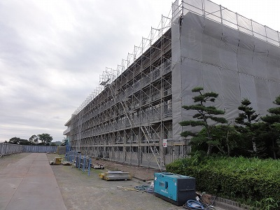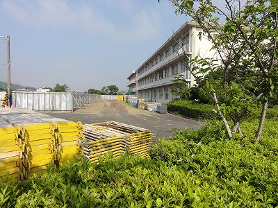 7/11(木)の栄中〜本校の耐震工事が本格的にスタートしてきています。グランド東側の駐車場付近は仮設の壁で囲まれ、駐車場には2階建ての工事事務所ができています。今週末の連休で校舎の外側に足場が組まれ、21日からの本格的な工事に備えます。なかなか大規模な工事ですので、8月末までの約1ヶ月間、保護者の皆様や来校される方にはいろいろとご迷惑をおかけします。申し訳ありませんが、よろしくお願いいたします。