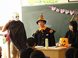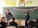 11/1(金)の栄中〜毎週金曜日はALTのエイドリアン先生が来てくださり、毎回楽しくて、ためになるけど、ちょっとアブナイ?授業が展開されます。今回は11/1(金)ということで、ハロウィーンをテーマとした授業でした。昨年もそうでしたが、高塚先生や教科係さんまでが仮装しての登場にクラスは大盛り上がり。とても楽しく、英語を活用した1時間でした。こういう生きた英語を使う機会がたくさんあると、。英語がもっともっと好きになるのでしょうね。