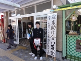 12/7(土)の栄中〜〜掛川地方はやや風が強いものの、朝から良く晴れて雲一つない好天に恵まれました。今日は、本校の近くにある道の駅「掛川」で行われた歳末助け合い募金活動のボランティアに本校生徒十数名が参加しました。国道1号線バイパス沿いにある道の駅「掛川」は開業以来、単なる休憩地点としてではなく、手ごろな価格の地元産品が数多く並べられる人気のポイントとして、有名で地元の方から遠方の方まで、幅広いお客さんがひっきりなしにやって来られます。「募金をお願いしまーす」と本校生徒が元気よく声をかけ、募金活動を行っていました。中には4箇所ある全ての入口に立つ生徒の募金箱の全てにお金を入れてくださる方もいて、とても活発な活動となりました。寒いな中でしたが、とても素晴らしい活動ができたと思います。関わってくださった皆様、参加してくれた生徒の皆さん、本当にありがとうございました。