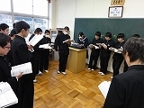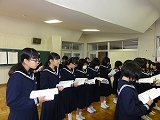 1/27(月)の栄中〜今朝は朝礼がありました。初めに校長先生のお話を聞きました。学期末、年度末を迎えていることから「画竜点睛」という言葉を紹介しつつ、1年間の最後の仕上げをしようというお話でした。「画竜点睛を欠く」ことのないよう。最後の最後までしっかりとがんばりたいですね。また、先日の百人一首大会の学級別獲得枚数の表彰もありました。3Bが1位、3Aが2位という結果でした。来週末はいよいよ私立高校入試です。3年生の皆さん、がんばってください。
