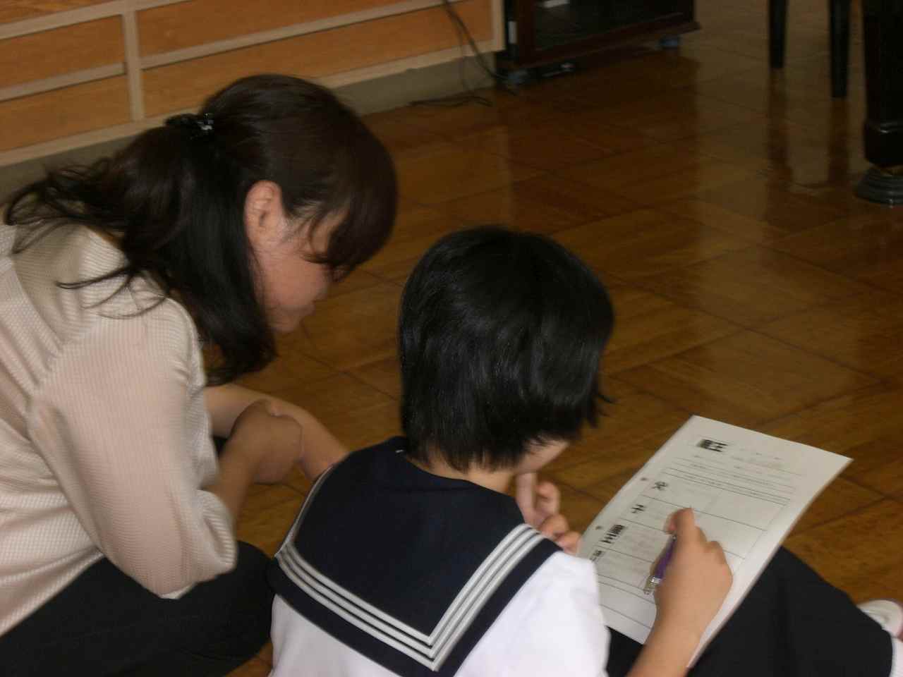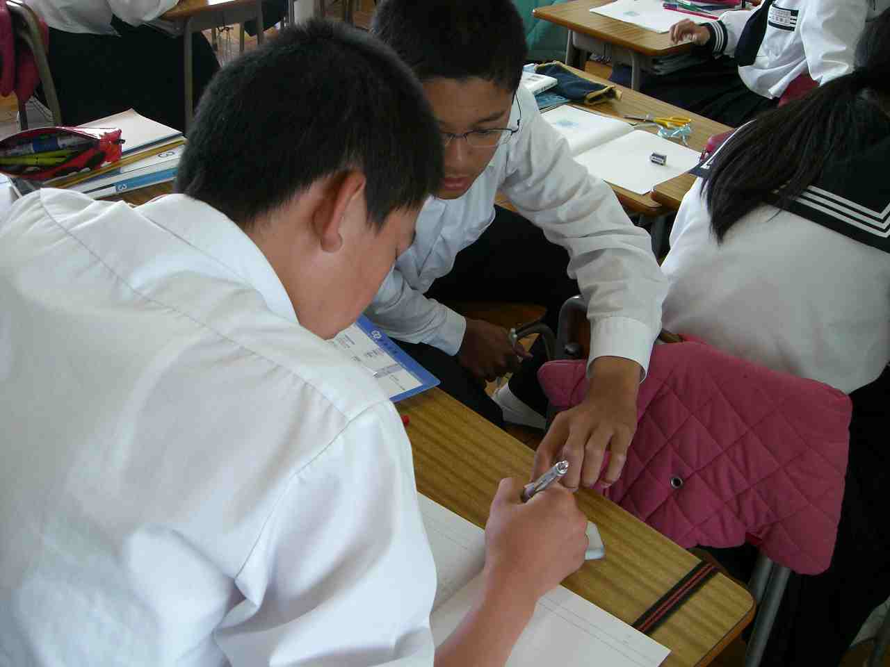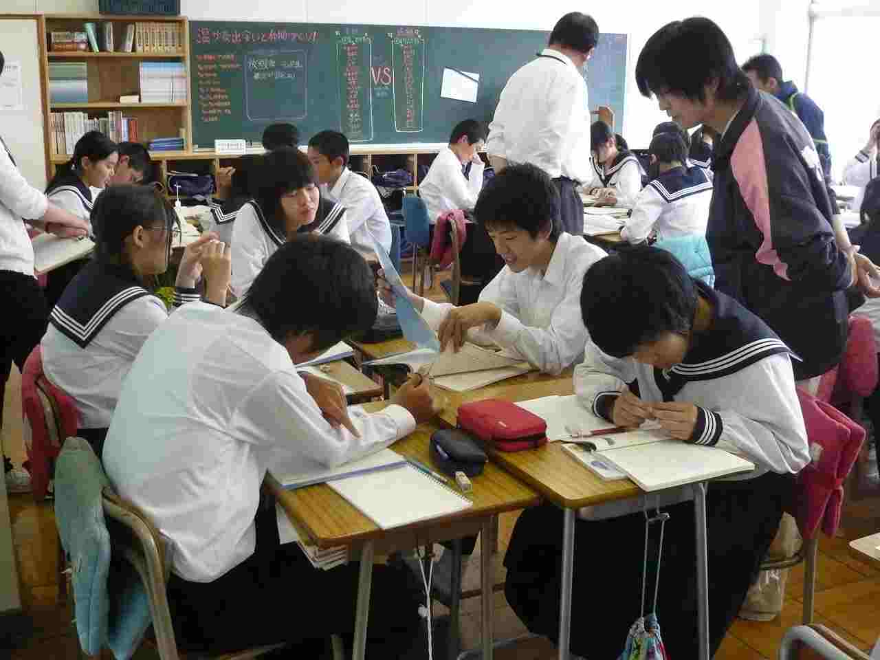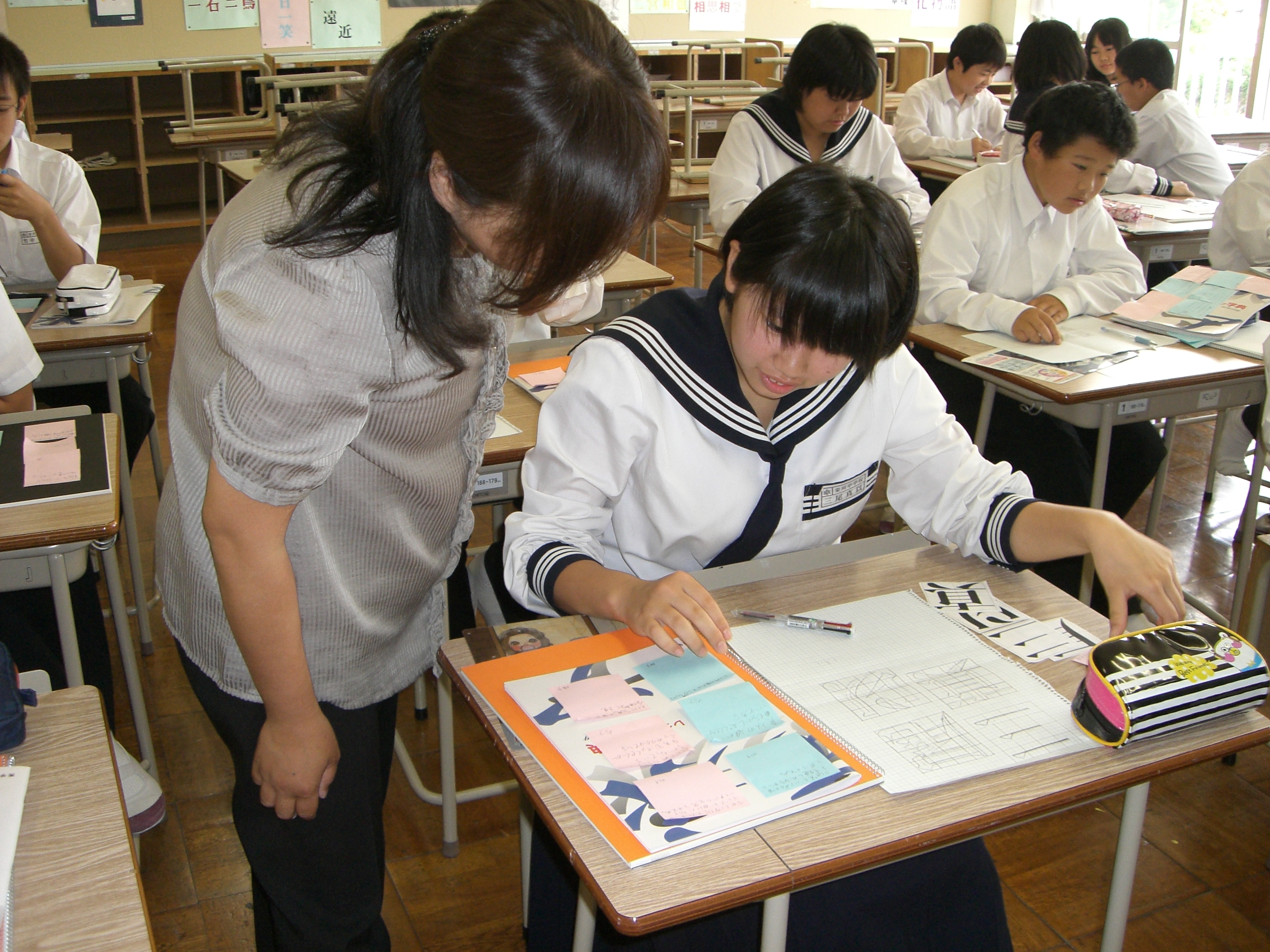 レタリングの本を参考に,自分の名前を明朝体で描いてみました。どんなところを改善すればよいか,小集団の仲間からアドバイスをもらってより良い形に仕上げていきます。掛川市教育委員会の小関先生にも授業に参加していただきました。(1年)