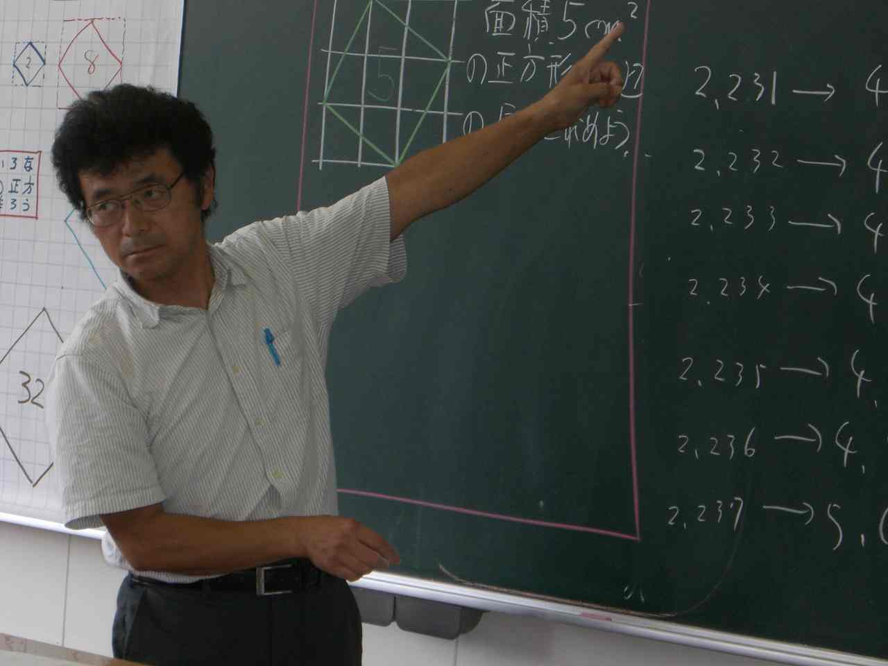 面積5cuとなる正方形を描いた後,一辺の長さがどれくらいになるか,小集団で近似値を求めました。その後,割りきれない数を表すために,√を用いて表すことを学習しました。(3年)