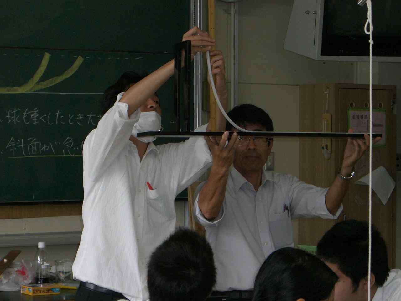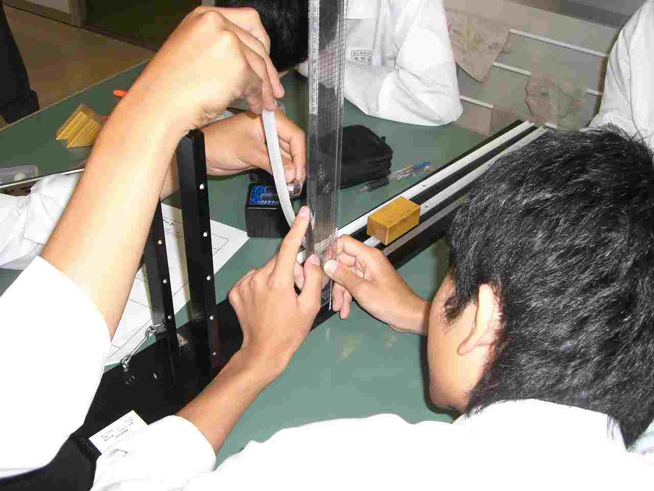 小集団で衝突実験機を使い,重りの質量や高さを変えると木片がどれくらい動くか確かめ,考察しました。レールの角度を変えての実験もおこないました。(3年)
